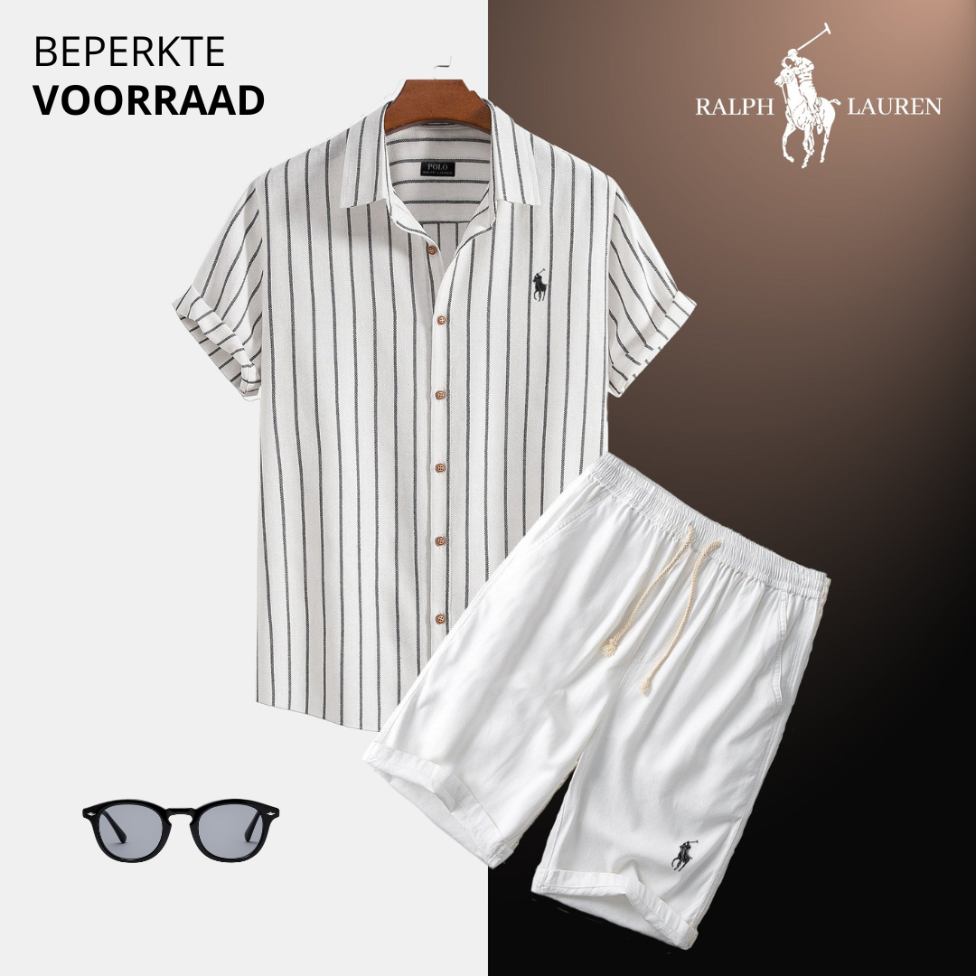 Het bestaat uit een gestreept overhemd met borduursel en een lichtgewicht short met een perfecte pasvorm, het is het ideale pakket voor je zomerse dagen — tussen ontspanning en uitgesproken elegantie.